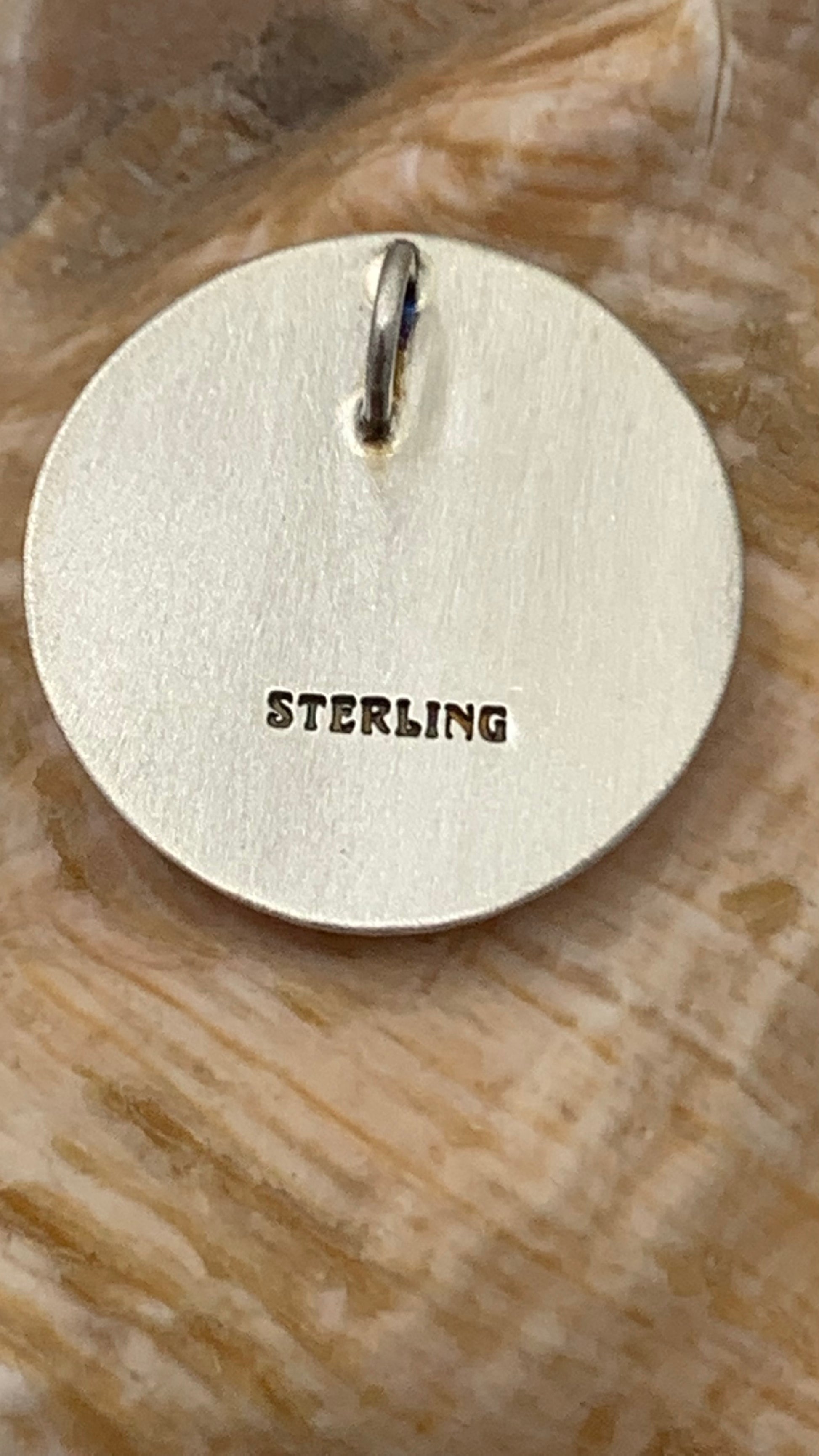 Square green mohave turquoise cabachon set in a fine silver bezel. The backplate is a hammered sterling silver circle.