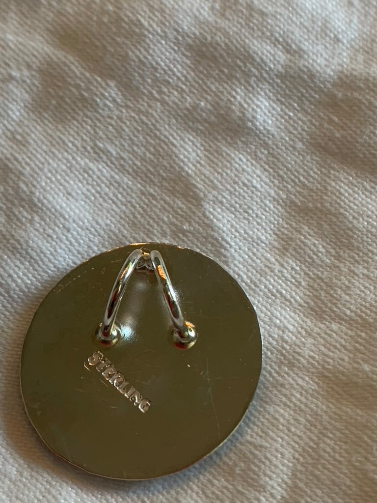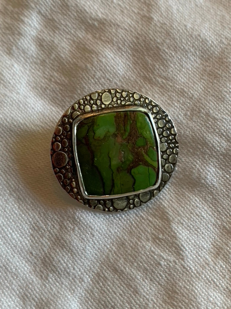 A square mohave turquoise cabachon is set in a fine silver bezel and rests upon a patterned sterling silver circle.