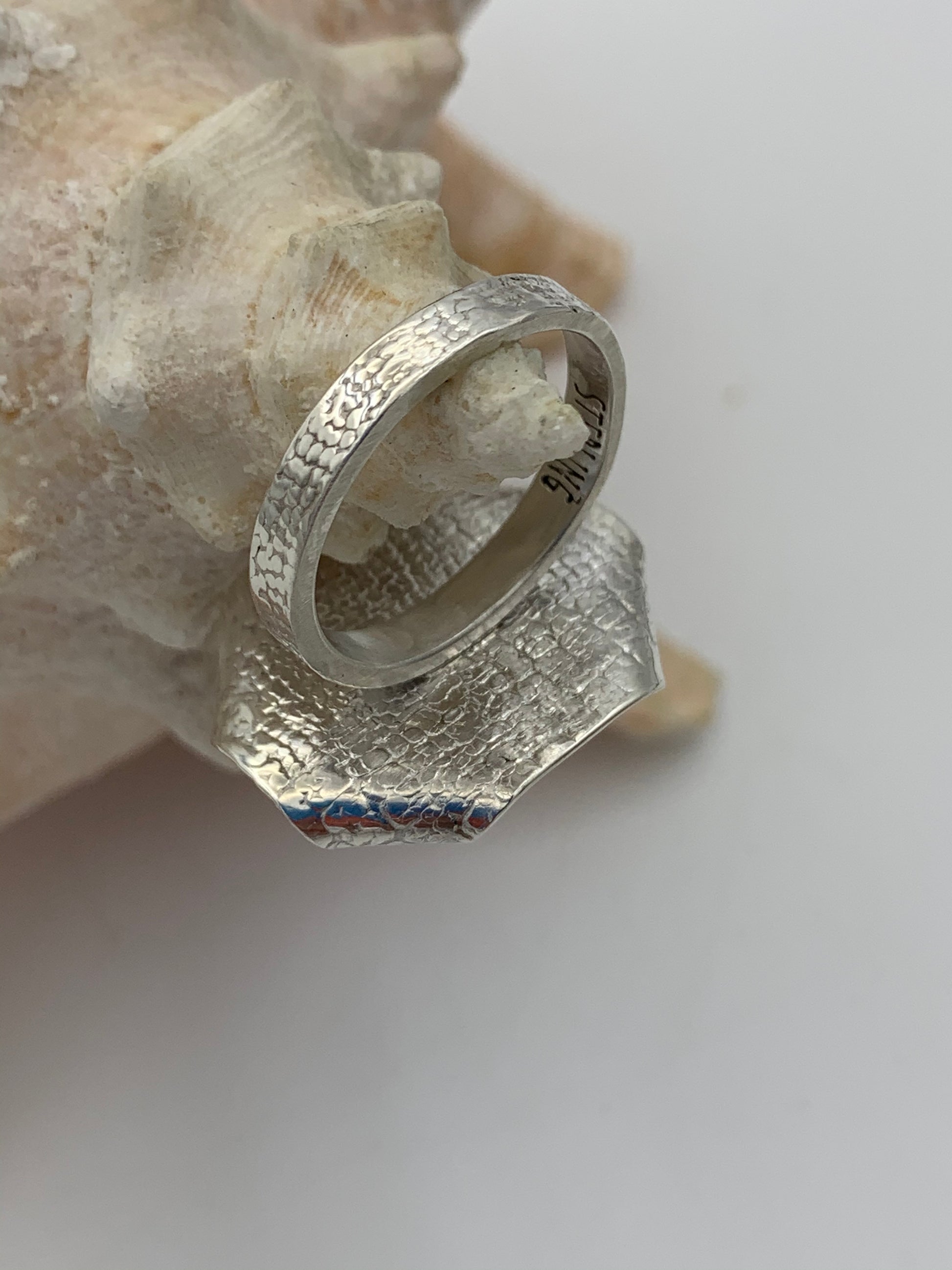 Amazing purple ruby cabachon set in a fine silver bezel that is shaped like a honeycomb. The backplate is snakeskin textured sterling silver with corners that curl upwards. The bottom side of the backplate and the sterling silver band carry the snakeskin imprint.