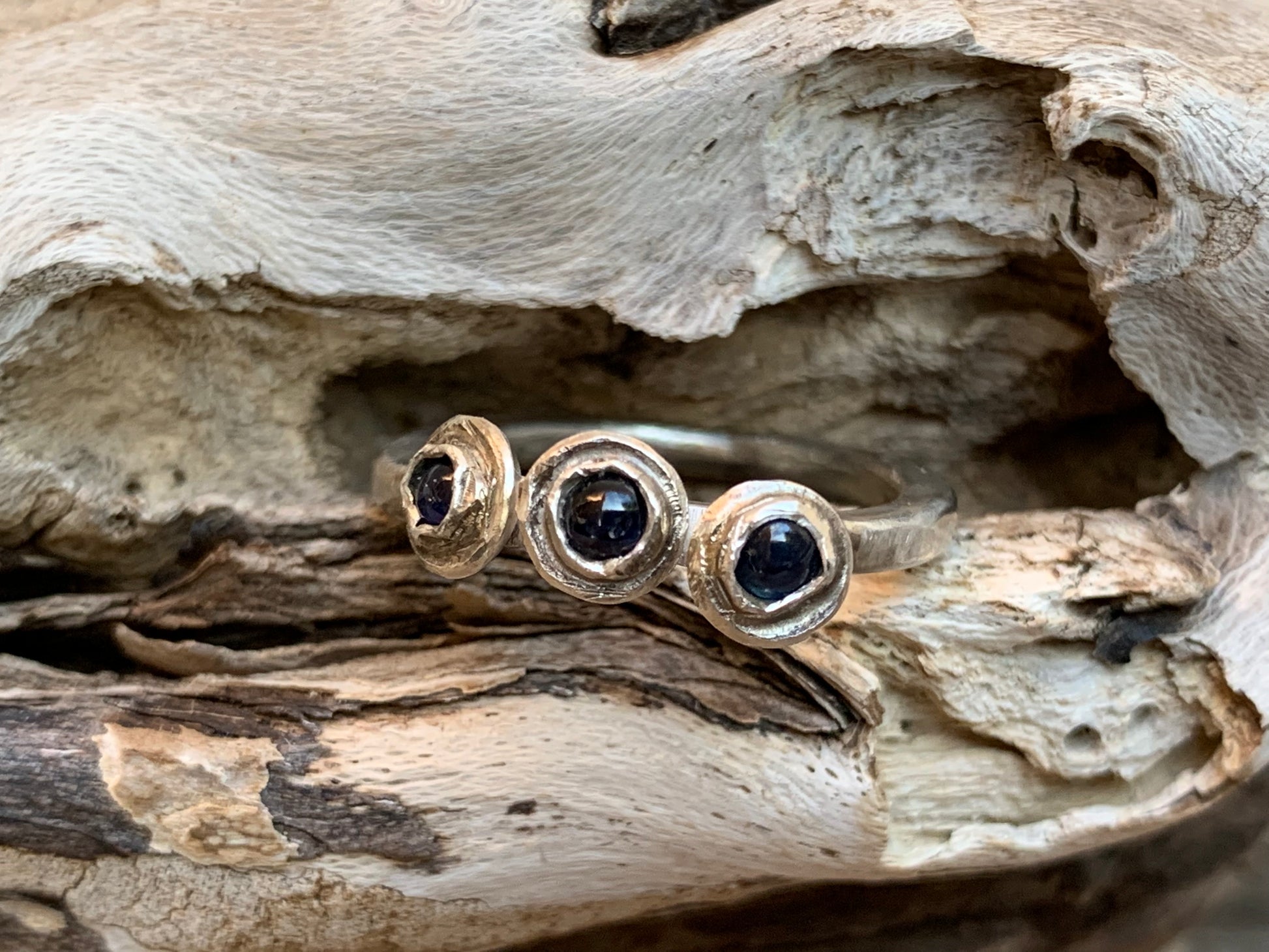 Three small blue sapphires are set in fine silver bezels and rest in tiny sterling silver bowls making them look like dainty blue flowers. The band is hammered sterling silver.