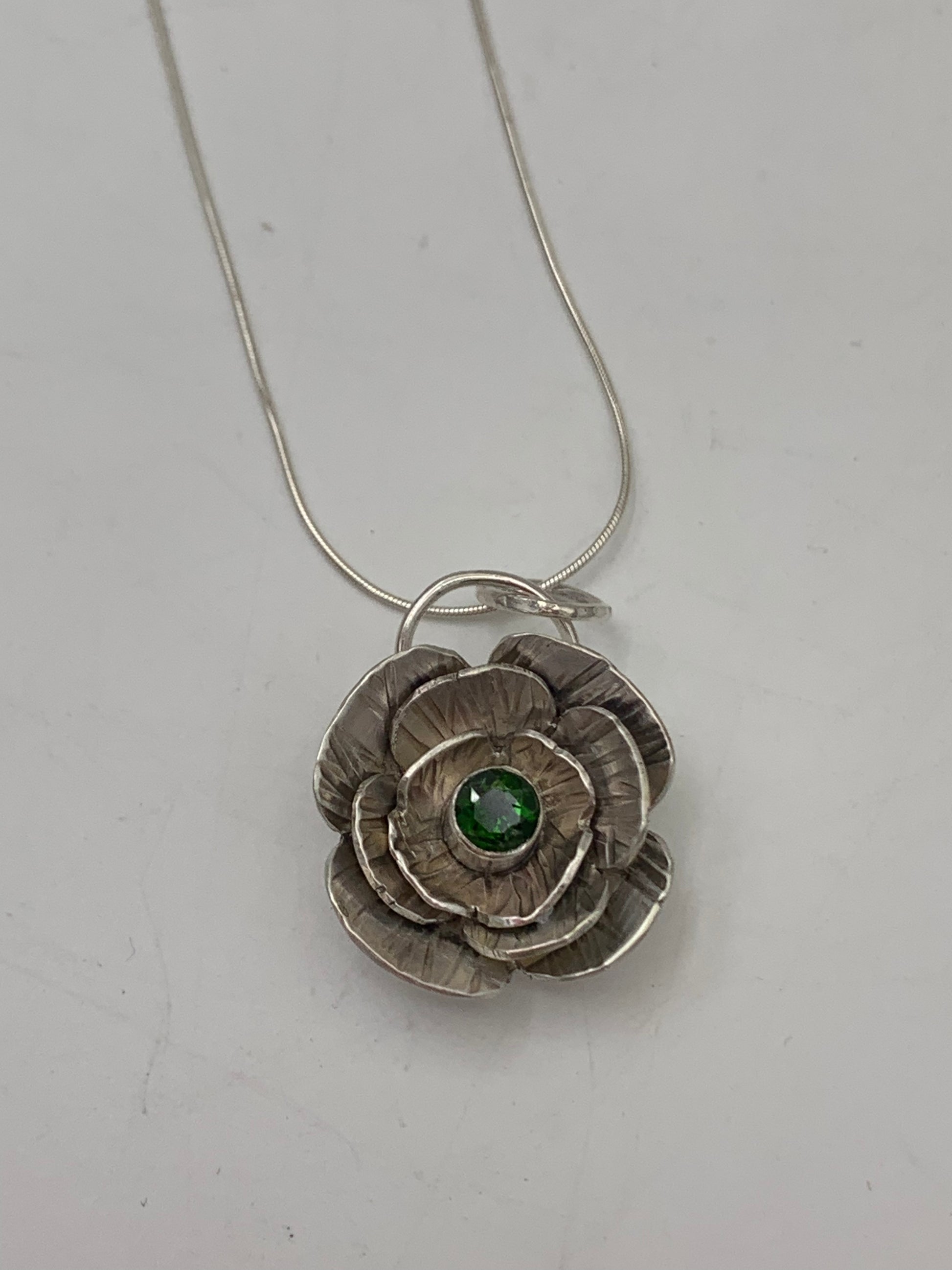 Three layers of concave sculpted silver petals come together to hold a tube set faceted green chrome diopside.