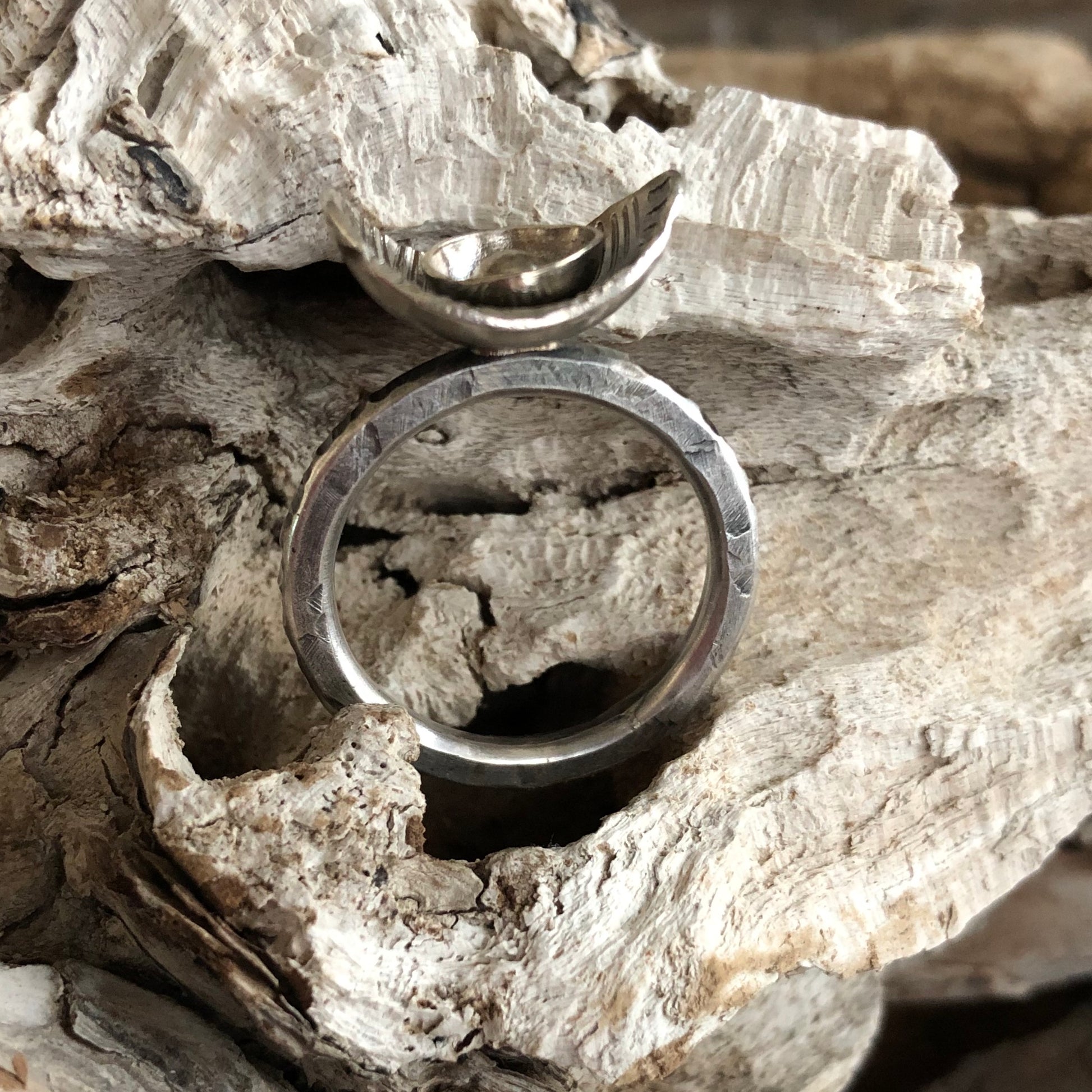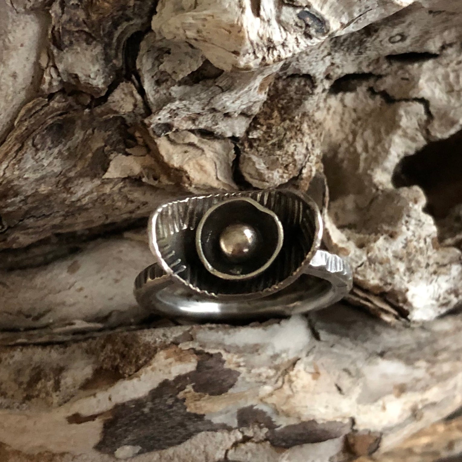 Handcrafted one of a kind sterling silver ring. An oblong textured oval holds a sterling bowl which holds a solid sterling sphere. The hammered band continues the texturing from the larger oblong bowl. Think evil eye!