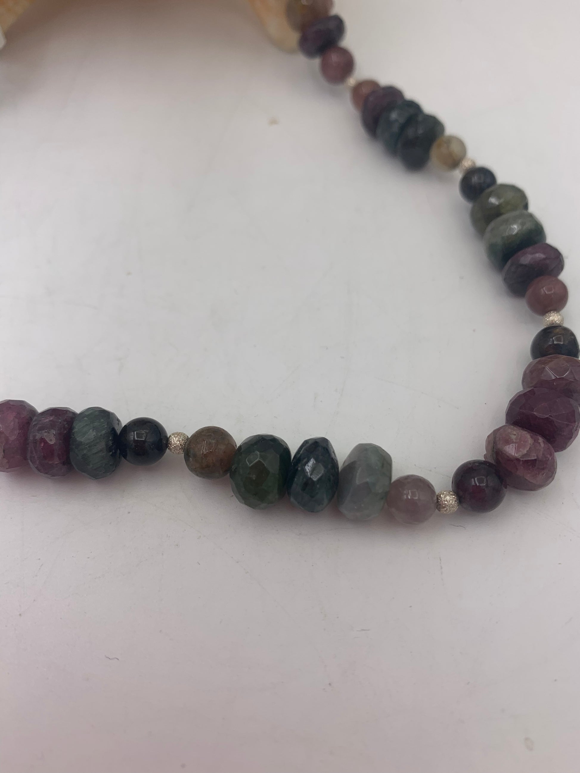 Multi color tourmaline beads strung with sterling silver stardust balls. Finished with a green peridot and sterling silver clasp.